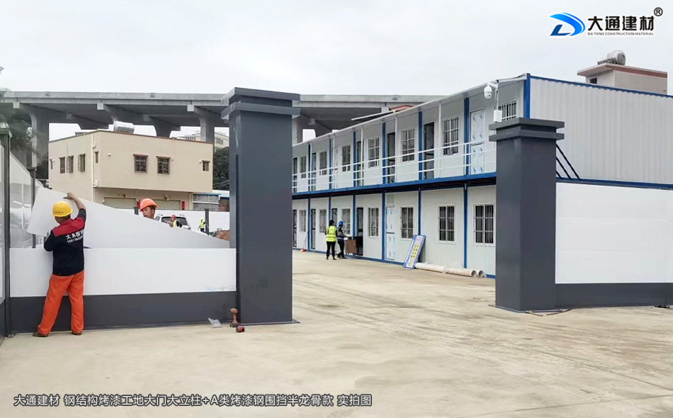 深圳建筑工地施工工程項目 選用了深圳市大通建材生產(chǎn)銷售/配送安裝的鋼結(jié)構(gòu)烤漆工地大門+A類烤漆鋼圍擋半龍骨款