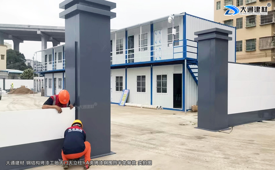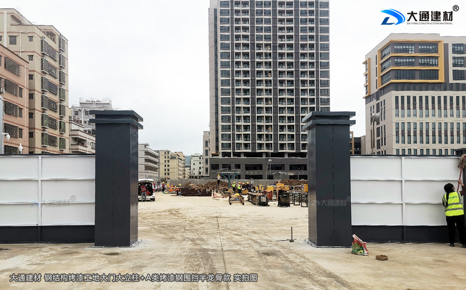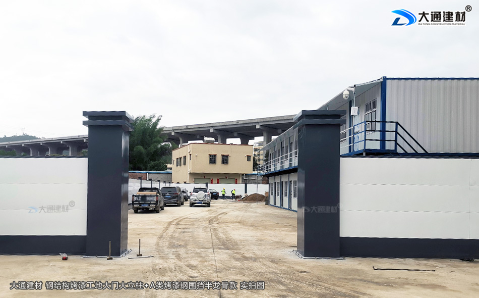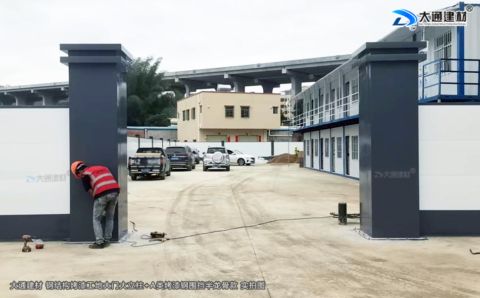 深圳市大通建材的鋼結(jié)構(gòu)烤漆工地大門立柱與A類烤漆鋼圍擋半龍骨款安裝完畢