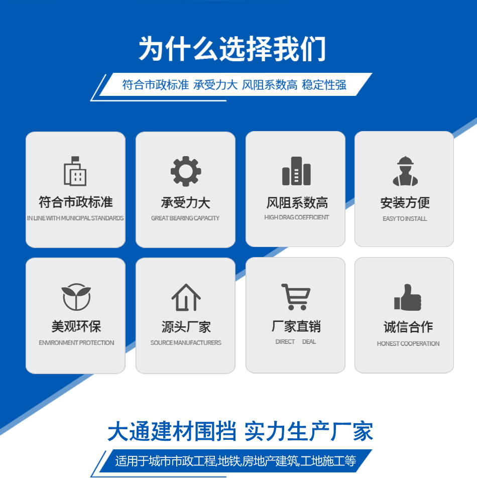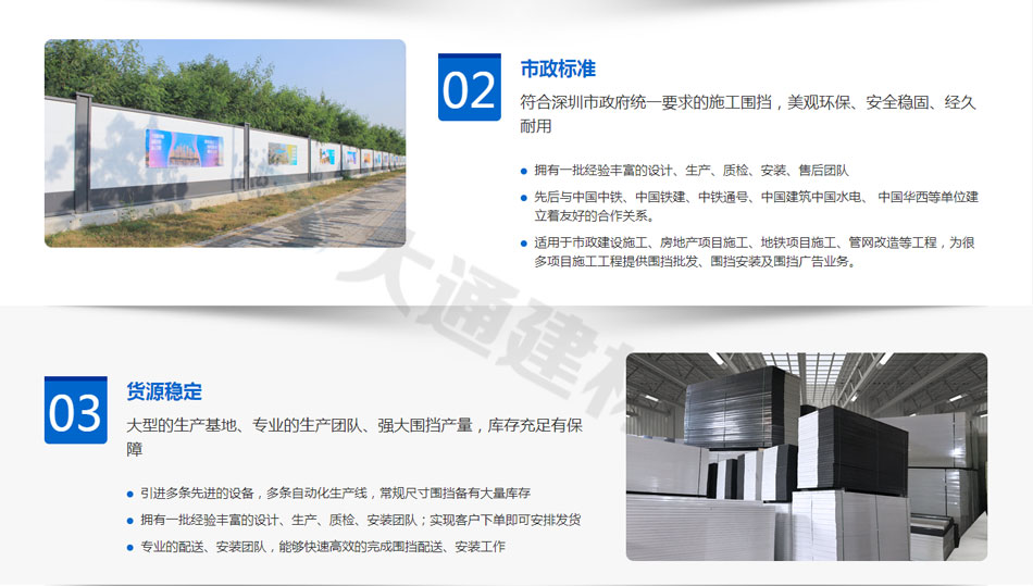 2019年,大通建材成為圍擋行業(yè)領(lǐng)先企業(yè),大通圍擋安全穩(wěn)固、美觀環(huán)保,適用于市政建設(shè)施工、房地產(chǎn)項(xiàng)目施工、隧道施工、地鐵項(xiàng)目施工、路橋維護(hù)施工、立面改造施工、廠房隔斷施工、管網(wǎng)改造等工程。