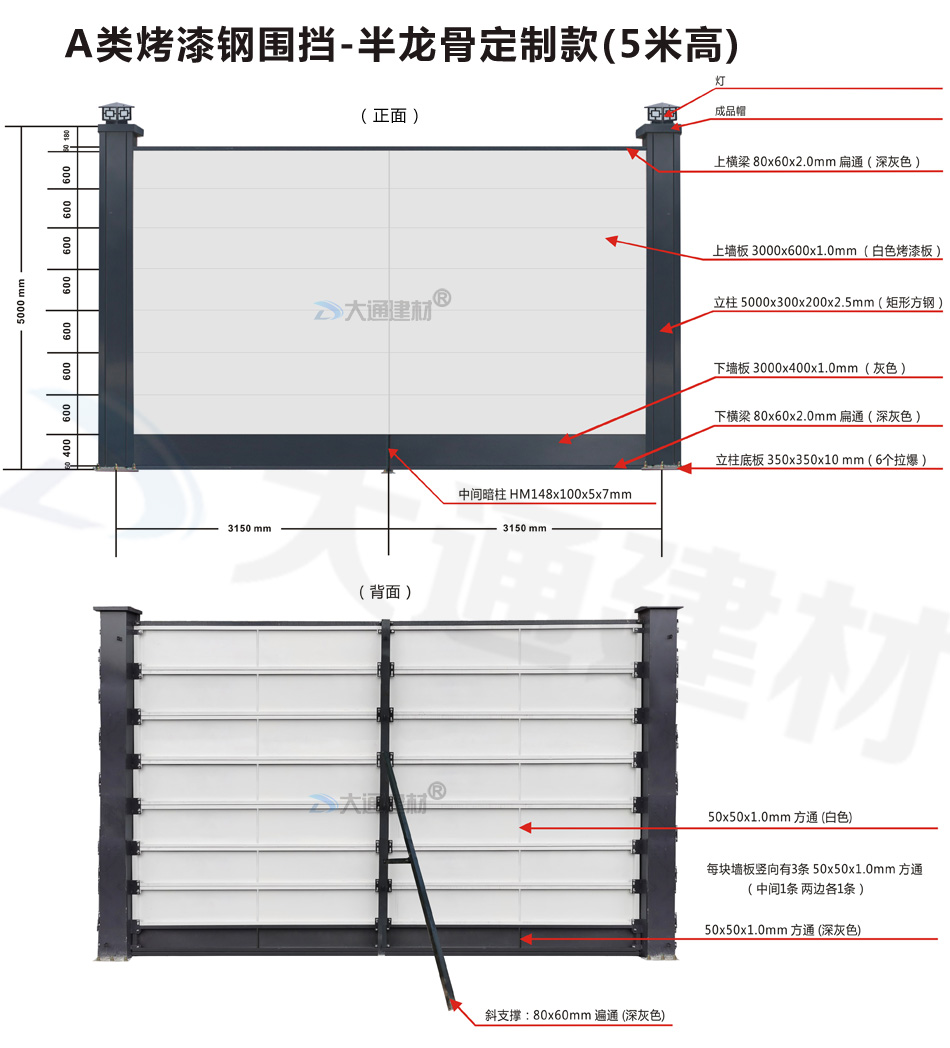 5米高A類烤漆鋼圍擋半/無龍骨款-支持定制生產