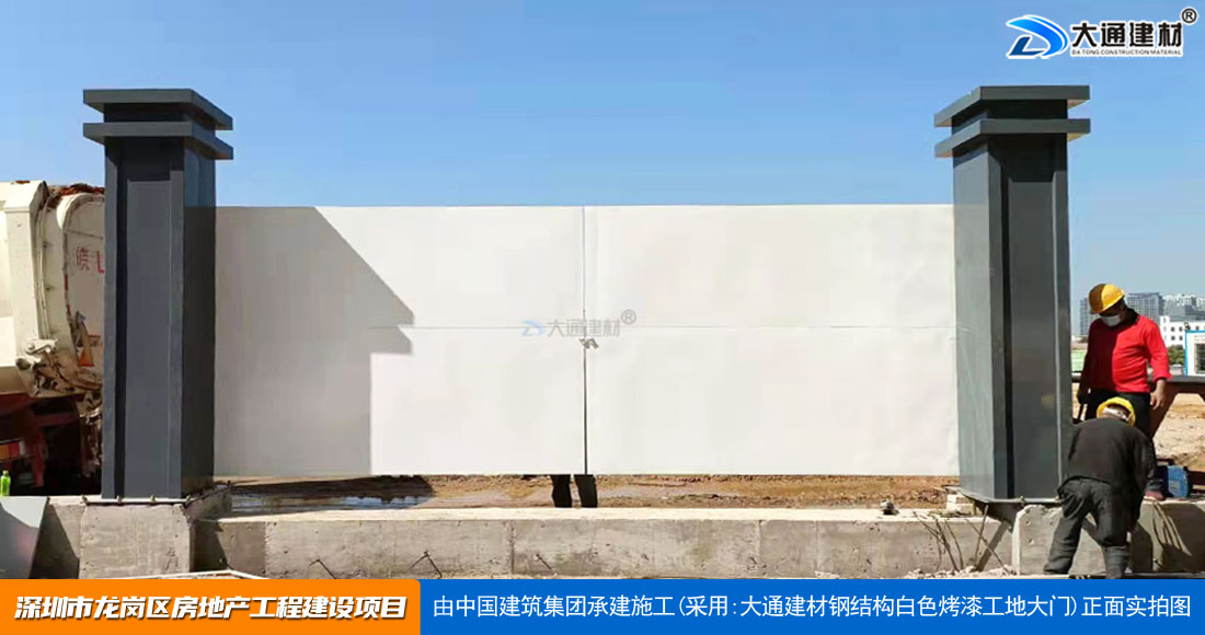 深圳大通建材生產銷售的工地烤漆雙開門-鋼結構工地大門適用于各種市政工程項目、房地產項目、地鐵修建項目施工、管網改造、小區改造、城市建設、道路修建等工程項目使用