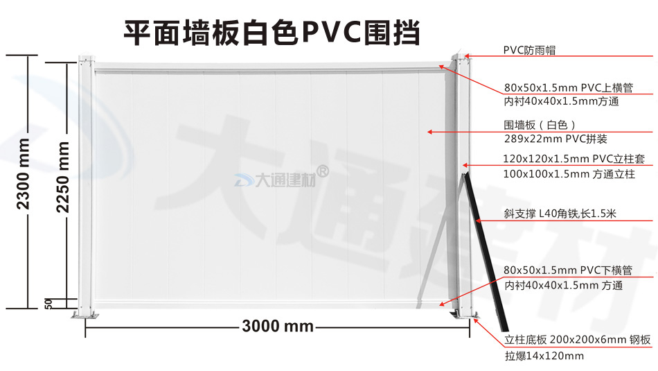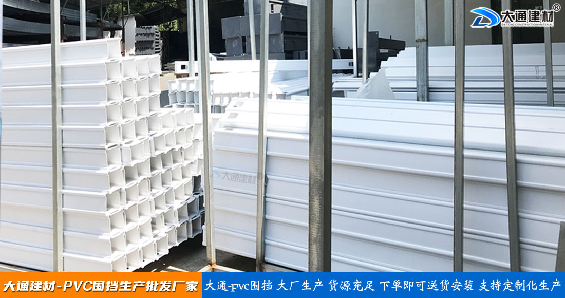 大通建材PVC圍擋立柱、橫管、擋板、斜支撐、橫撐加強筋等部件按照設(shè)計與生產(chǎn)標準,尺寸與工藝實現(xiàn)標準化生產(chǎn)和標準化拼接安裝,從而達到高效率生產(chǎn)、快速運輸和拼接式安裝,大大降低了圍擋的采購成本。