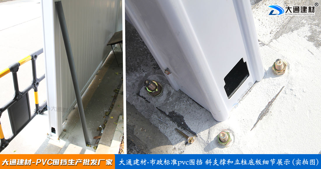 深圳市大通建材生產批發PVC圍擋符合市政標準,這款圍擋的圍墻板面采用PVC長條版拼接,立柱、橫管均為PVC材料,內部均襯方通。立柱底板為鋼板,并加斜撐受力。大通建材常規款PVC圍擋尺寸長3mx高2.5m、長3mx高2.2m、長3mx高2.0m 其它PVC圍擋尺寸可按實際需要進行定制生產。